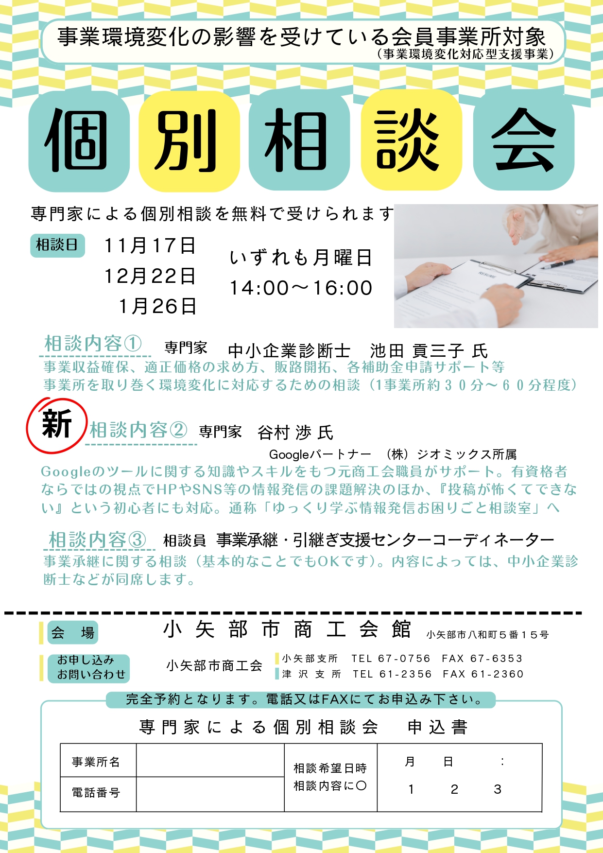 相談内容① 事業収益確保、適正価格の求め⽅、販路開拓、各補助⾦申請サポート等 事業所を取り巻く環境変化に対応するための相談(1事業所約30分∼60分程度)