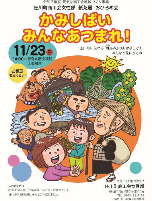 庄川町商工会女性部では、庄川町に伝わる「種もみ」のかみしばい『五ケの種もみ』をつくりました。